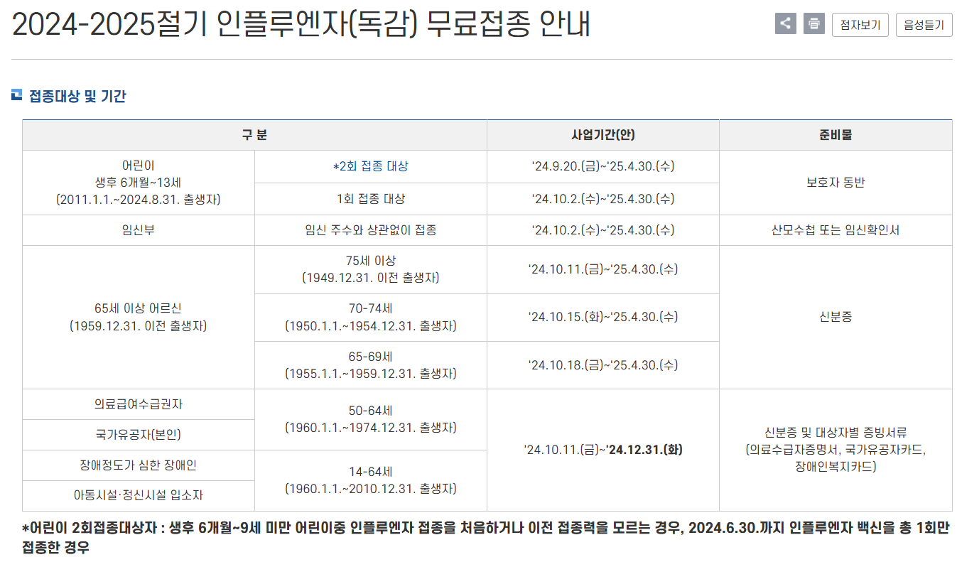 2024-2025 인플루엔자(독감) 무료접종 대상